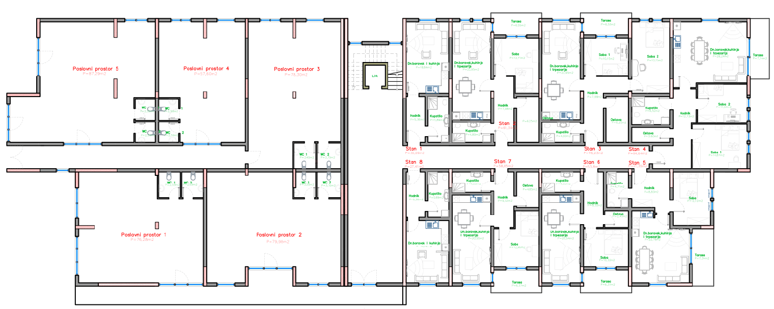 Prikaz tlocrta jasno pokazuje poziciju stana unutar sprata i njegov odnos prema ostalim jedinicama. Označena lokacija omogućava lakše razumijevanje rasporeda prostorija i orijentacije stana. Na ovaj način možete steći potpunu sliku o funkcionalnosti i položaju Vašeg budućeg doma.